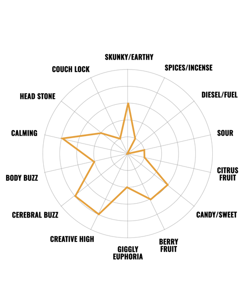 | Terpene | Myrcene, Caryophyllene, Limonene |