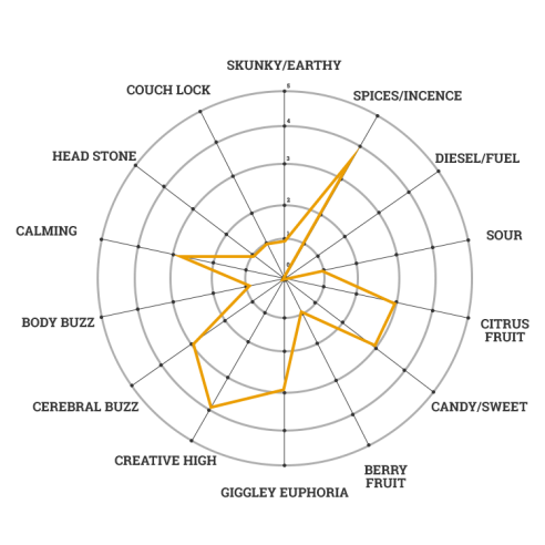 The aroma of this strain is a good reflection of its flavor. The pine and citrus elements make themselves felt immediately, but there is a solid body of earth and wood to give it strength and robustness.  Some people have suggested that this combination creates a herbal flavor, reminiscent of sage.